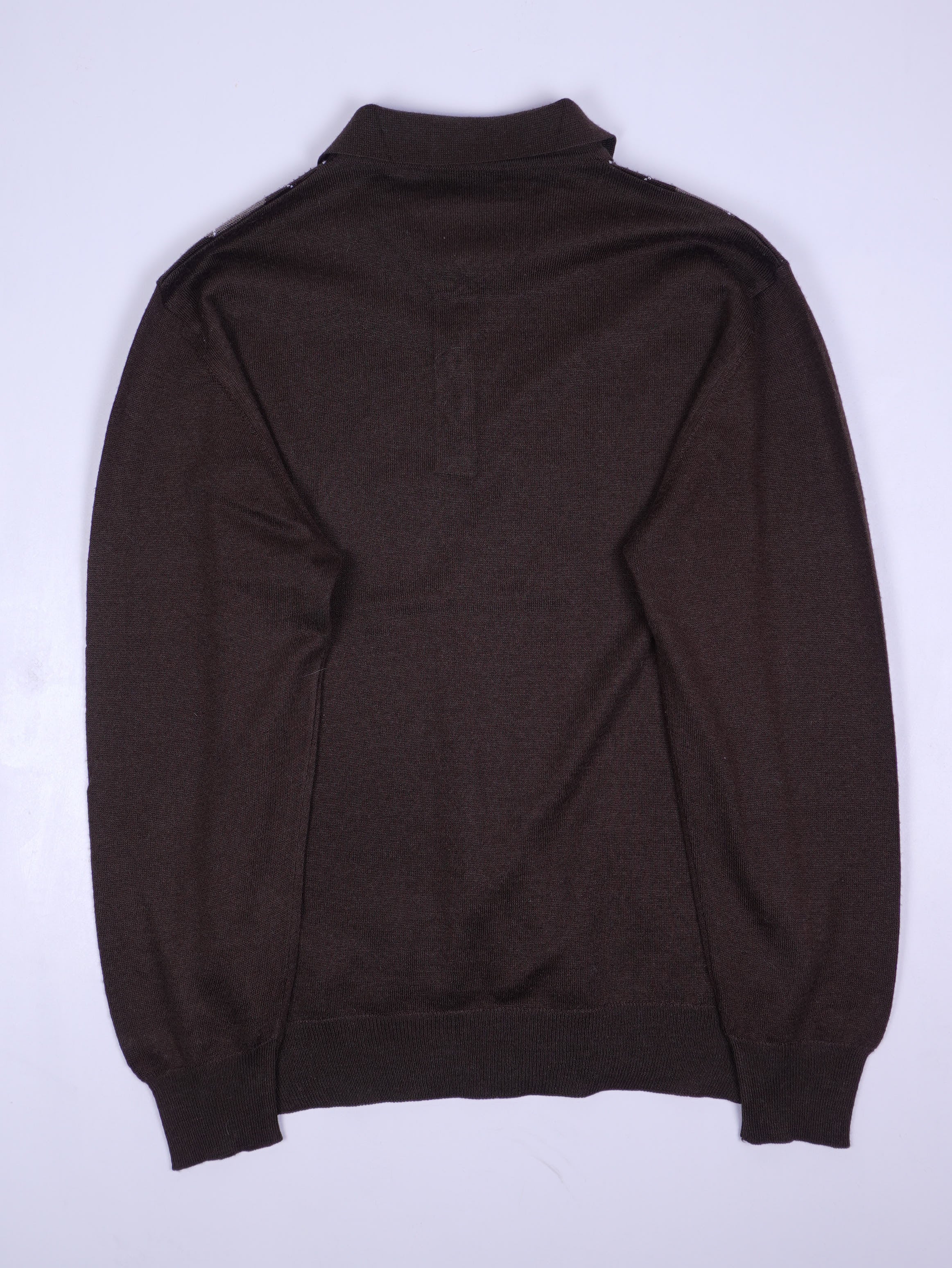 Details: Feinstrick-Pullover mit Polokragen und kurzer Knopfleiste (3 braunrote Knöpfe). Klassisches Argyle/Rauten-Muster auf der Front in Creme, Grau und Dunkelbraun mit weißen, gestrickten Diagonallinien; Rücken uni. Gerippte Bündchen an Ärmeln und Saum, weicher Strick (Material nicht erkennbar). Innenlabel: „ENZO di MILANO“.