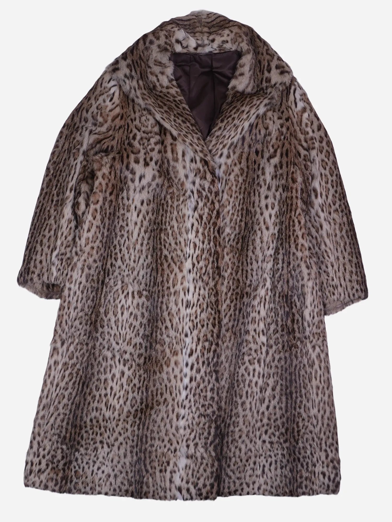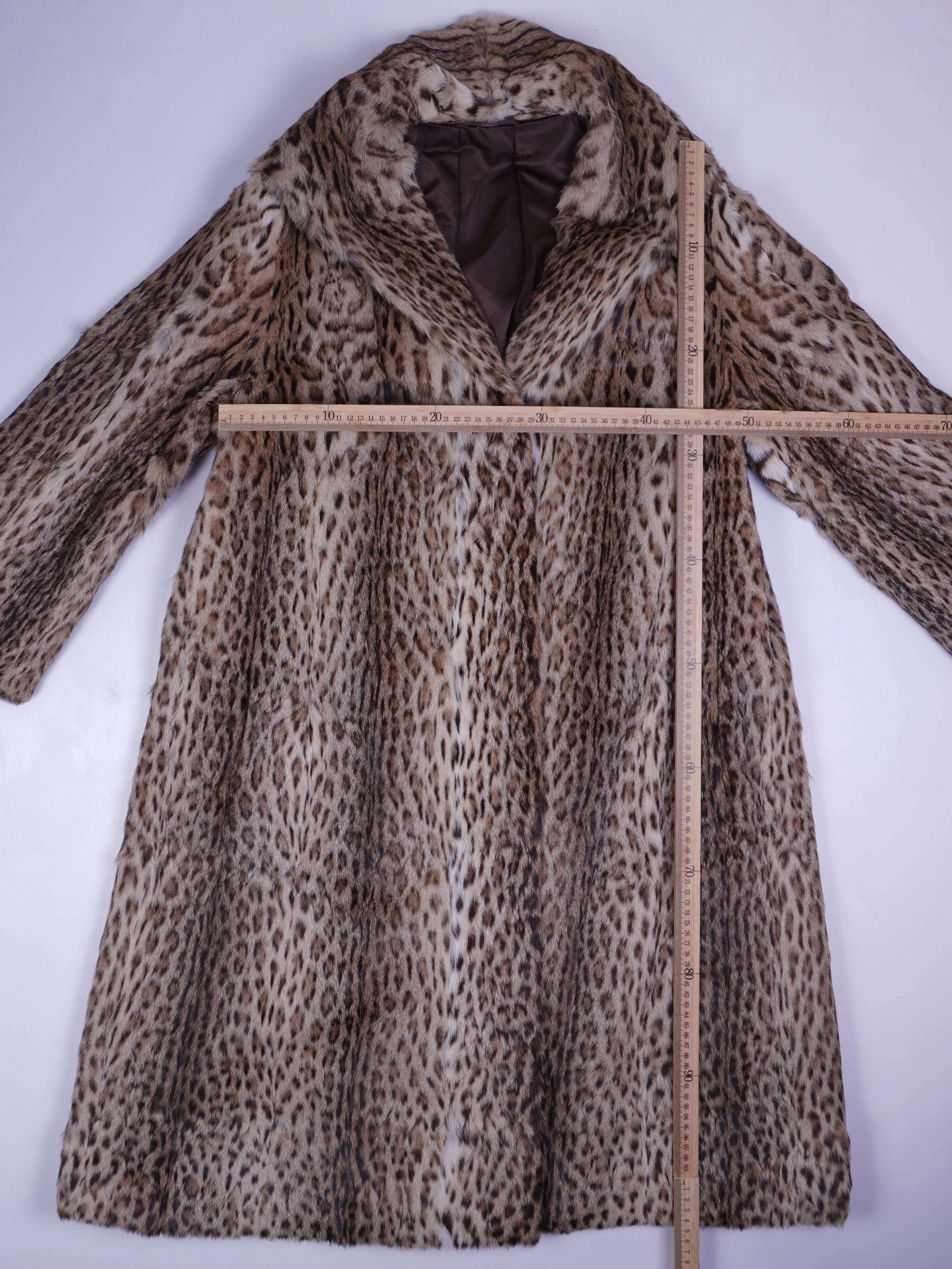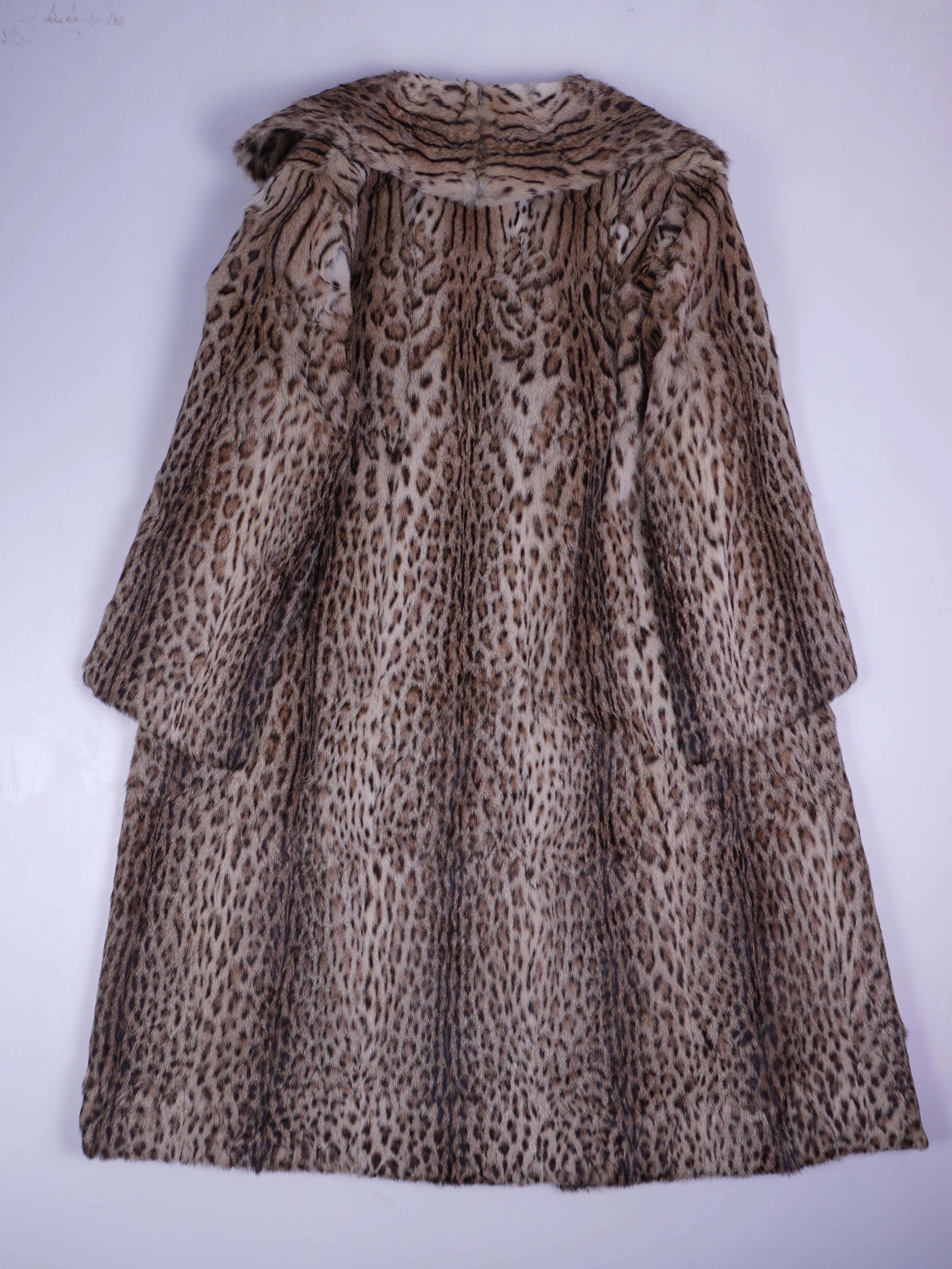 Details: Langer Fellmantel mit starkem Leoparden-/Raubtierprint, breitem Reverskragen, weiter A-Linie und knielanger bis wadenlanger Länge; dichtes, flauschiges Fellimitat bzw. Fell; innen dunkelbraunes Futter; verdeckte Vorderseite ohne sichtbaren Verschluss; klassische Vintage-Couture-Anmutung.