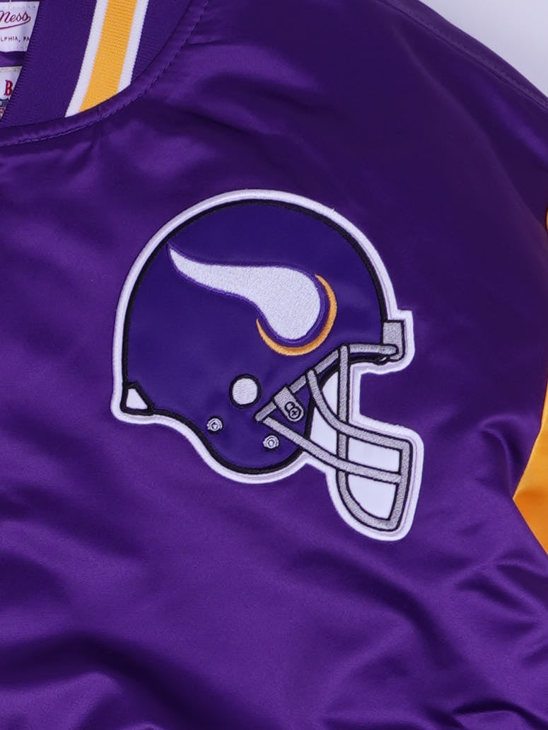 Details: NFL Throwbacks Satin-Collegejacke im Minnesota Vikings Farbschema: glänzender lila Satin mit goldenen/weißen Colorblock-Ärmeln, gestreifte Rippbündchen an Kragen/Saum/Ärmeln und Druckknopf-Leiste. Vorderseite mit großem Vikings-Helm-Patch (Stick/Applikation) und NFC-„N“-Patch mit Sternen; Rückseite mit großem „VIKINGS“-Schriftzug. Innen gelb gesteppt (Rautenstepp), seitliche Eingrifftaschen.