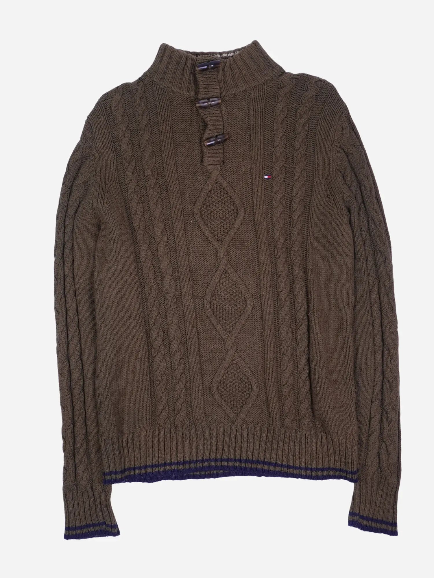 Details: Brauner/olivbrauner grob gestrickter Zopfmuster-Pullover (Wool Blend) mit Halfzip am Kragen und zusätzlicher Knebel-/Toggle-Leiste (3 Knebel). Stehkragen innen mit navy/weißem Streifenstrick, kleine Tommy-Flagge auf der Brust. Gerippte Bündchen und Saum mit navy/olivfarbenen Streifen.