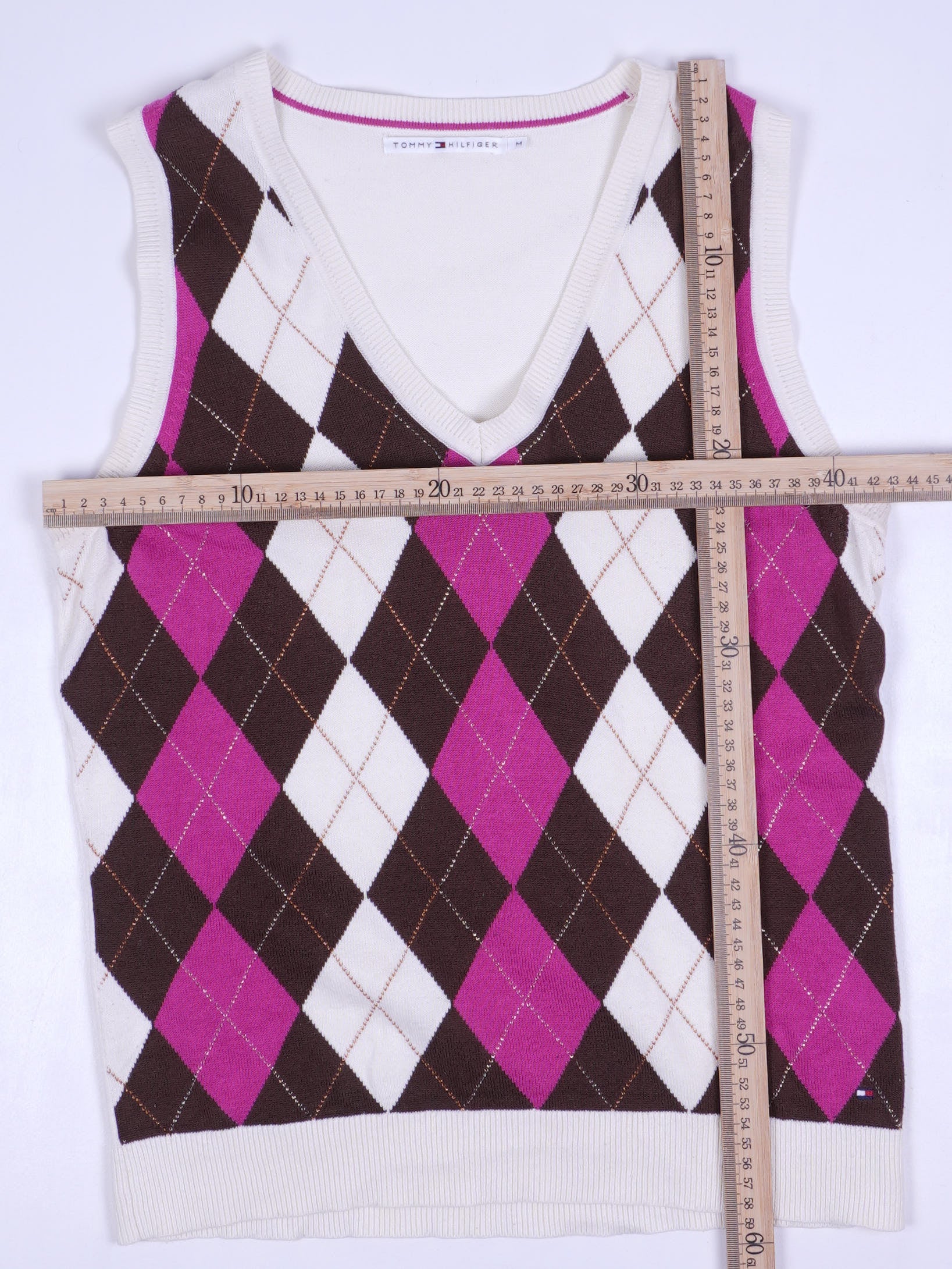 Details: Ärmelloser Strick-Pullunder mit V-Ausschnitt und klassischem Argyle/Rautenmuster in Braun, Weiß und Pink/Fuchsia; feine Kontrast-Zierlinien (diagonal gestrickt) innerhalb der Rauten. Gerippte Abschlüsse an V-Neck, Armausschnitten und Saum; kleiner Tommy-Hilfiger-Flaggenpatch unten rechts am Vorderteil, innen Nackenlabel „TOMMY HILFIGER“ (Größe M). Rückseite überwiegend uni Weiß mit seitlich auslaufendem Muster.