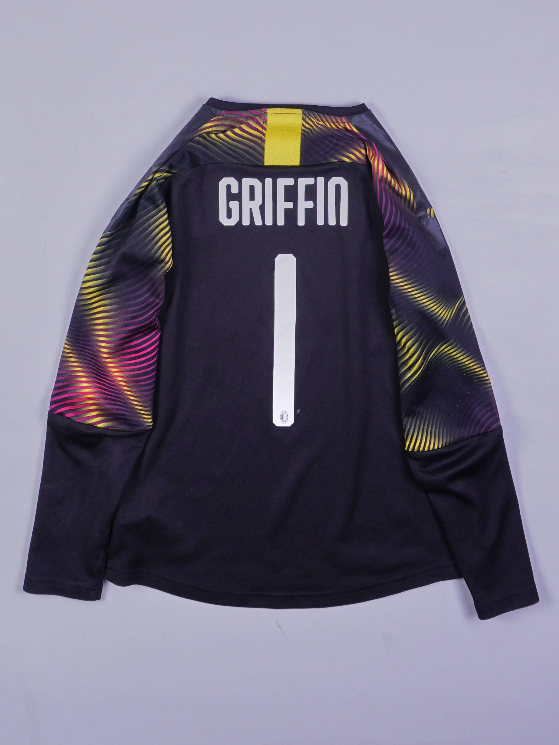 Details: Schwarzes Trikot mit Farbdimensionalität an Ärmeln, Vereinslogo und Sponsorenlogo vorne.