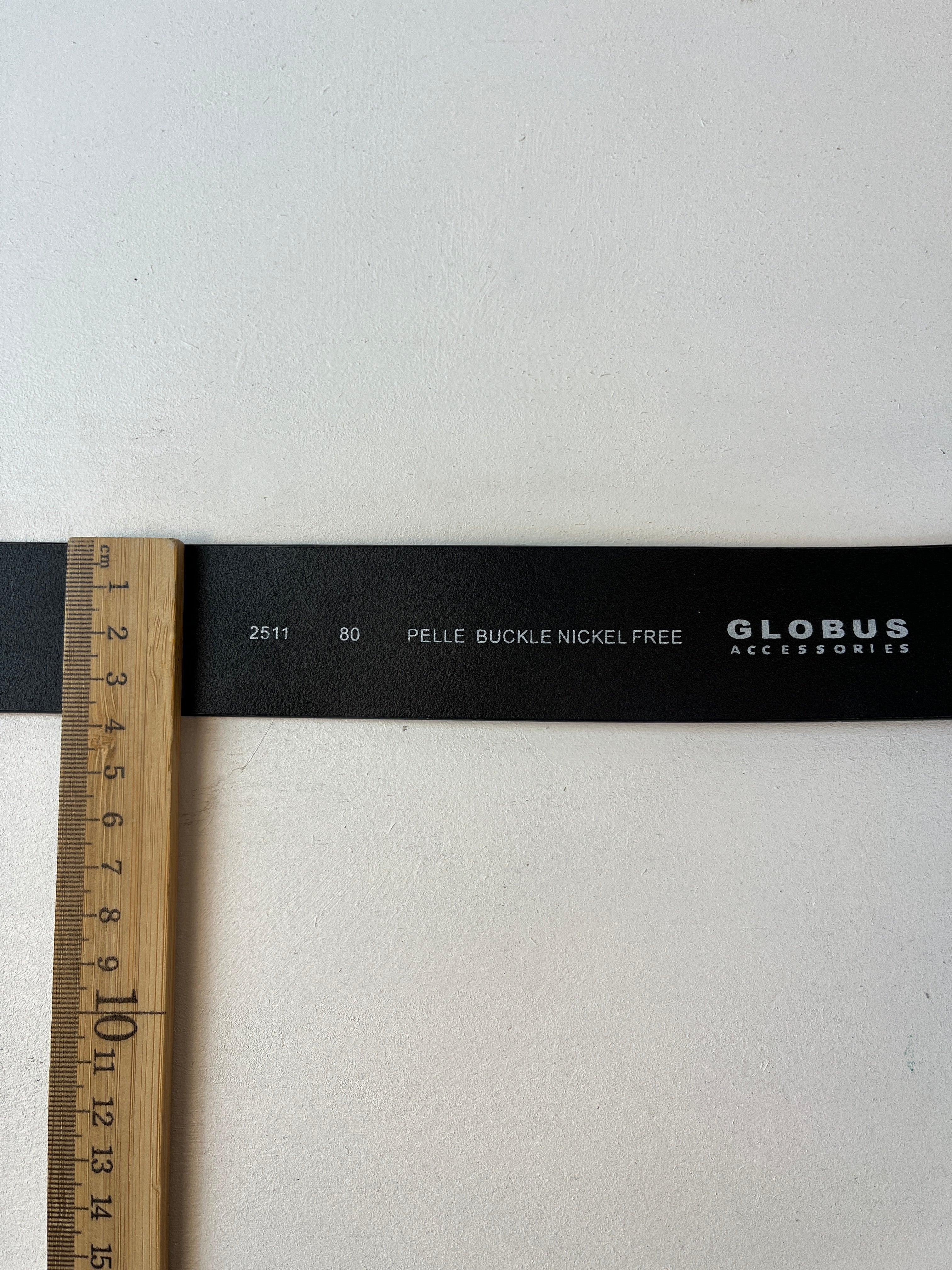 Details: Breiter schwarzer Ledergürtel mit großer, gebürsteter Metall-Dornschnalle in markanter oval-rechteckiger Form; nickelfreie Schnalle („PELLE BUCKLE NICKEL FREE“), matte Oberfläche, mehrere Lochungen zur Weitenregulierung, dezenter Logoprint „GLOBUS ACCESSORIES“ innen am Riemen.
