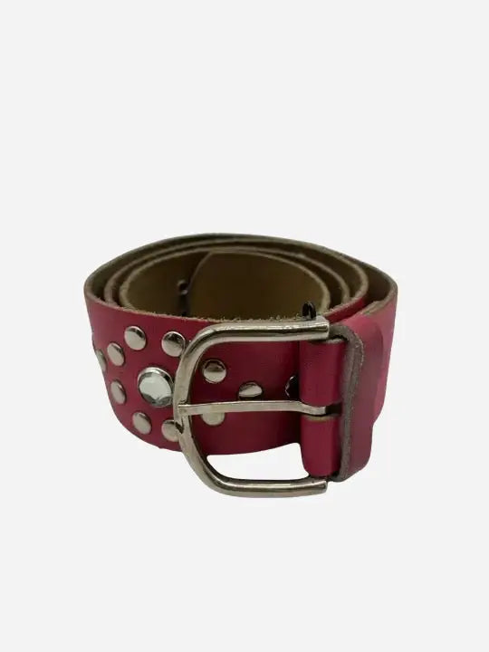 Details: Pinkfarbener, breiter Gürtel mit silberner Metallschließe, rundherum silberne Flachnieten, dekoratives Nietenmuster in Blumenform mit großem, klarem Zierstein, zahlreiche Lochungen entlang der Länge, Rückseite raues, naturfarbenes Material, typischer Y2K-/Rock-Style.