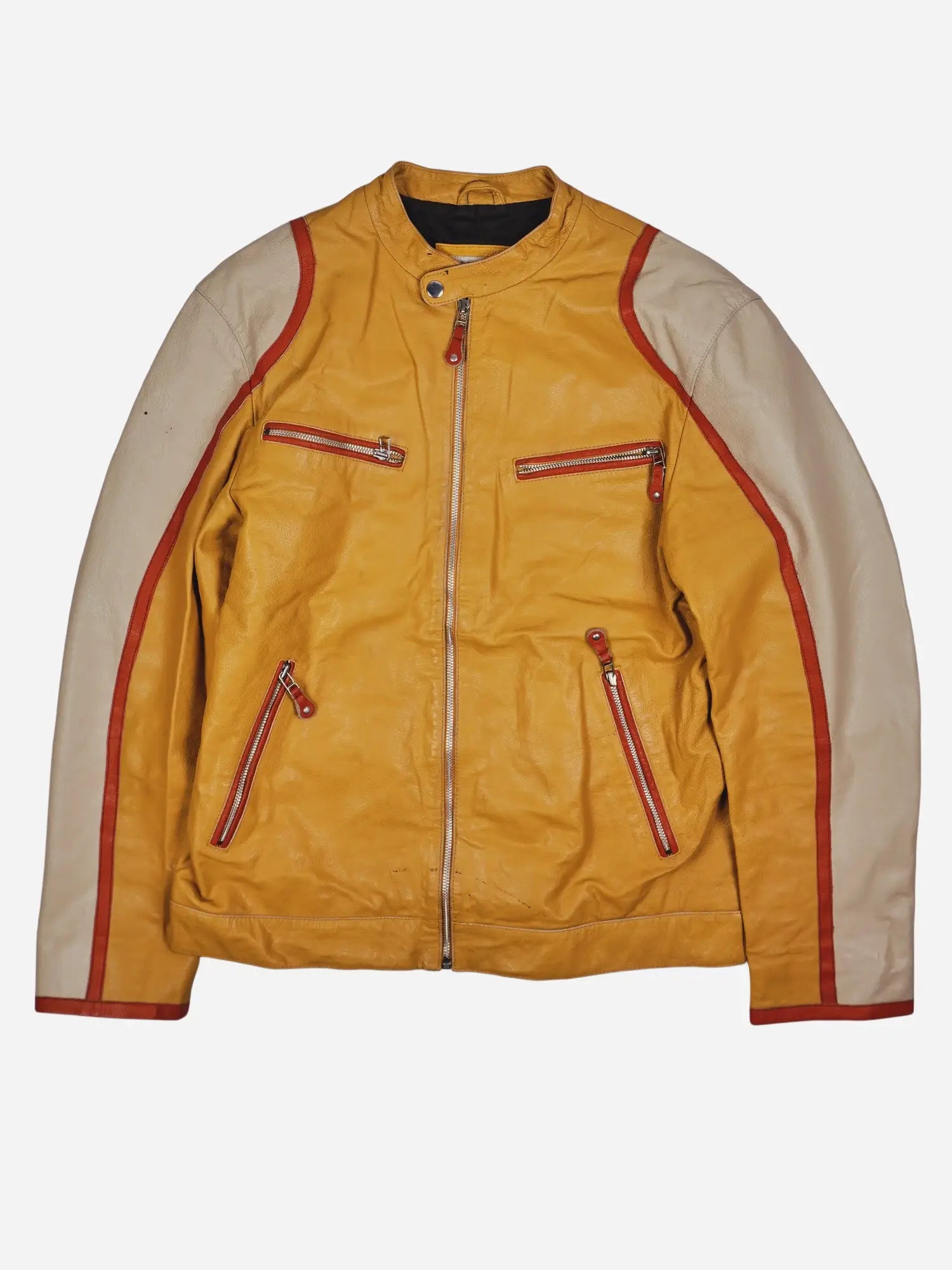 Details: Gelbes und cremefarbenes Leder, rote Lederpaspeln, kontrastfarbene Reißverschlüsse mit Lederzipper, vier Außentaschen, Stehkragen mit Druckknopfverschluss, ohne sichtbare Außenschnallen, markante Farbblöcke im Retro-Stil, durchgehendes schwarzes Innenfutter.