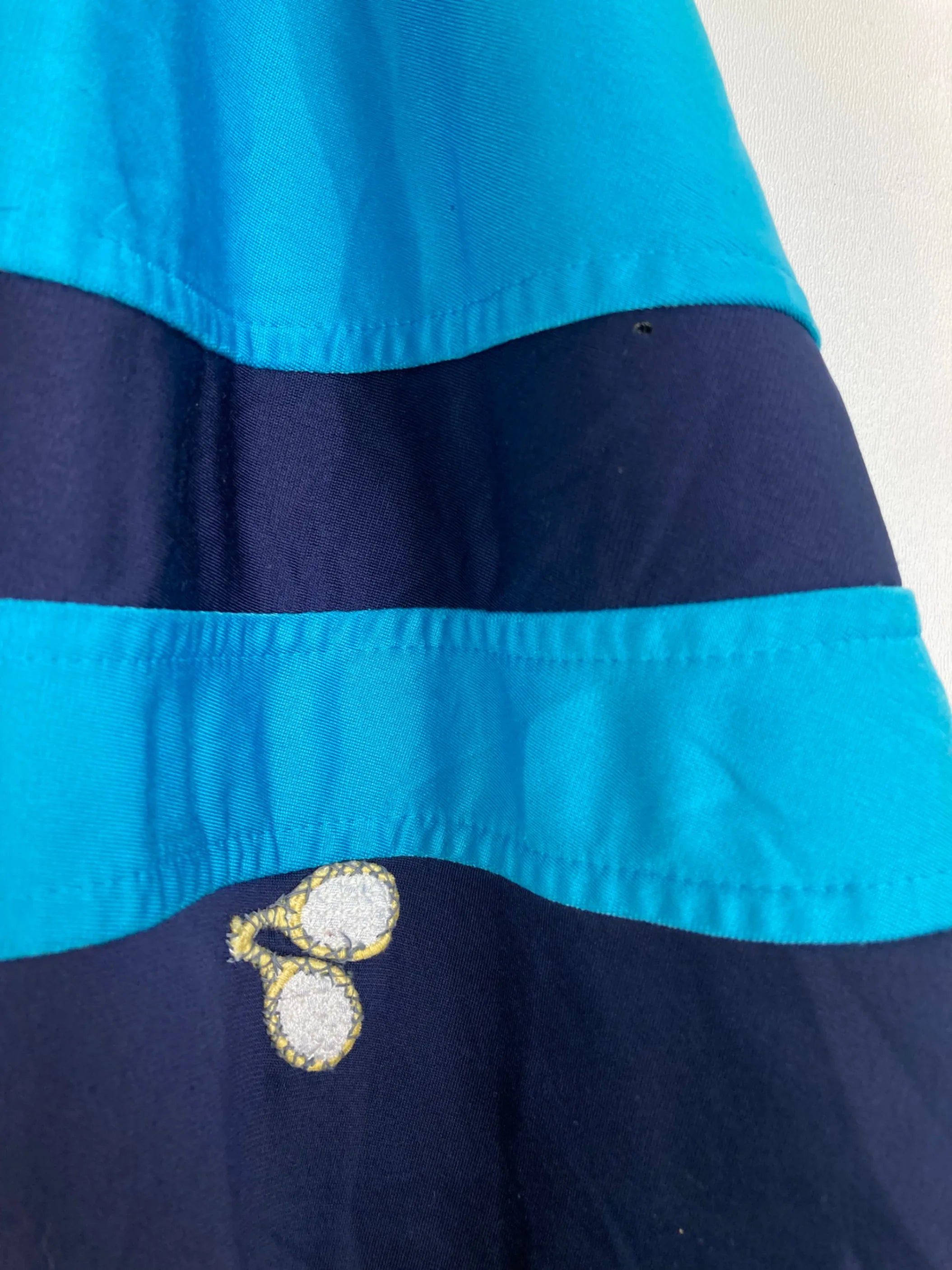 Details: Navy Track Jacket mit hellblauen Streifen entlang der Brust und Ärmel. Tennisillustration auf dem Ärmel. Ribbed cuffs und Saum.