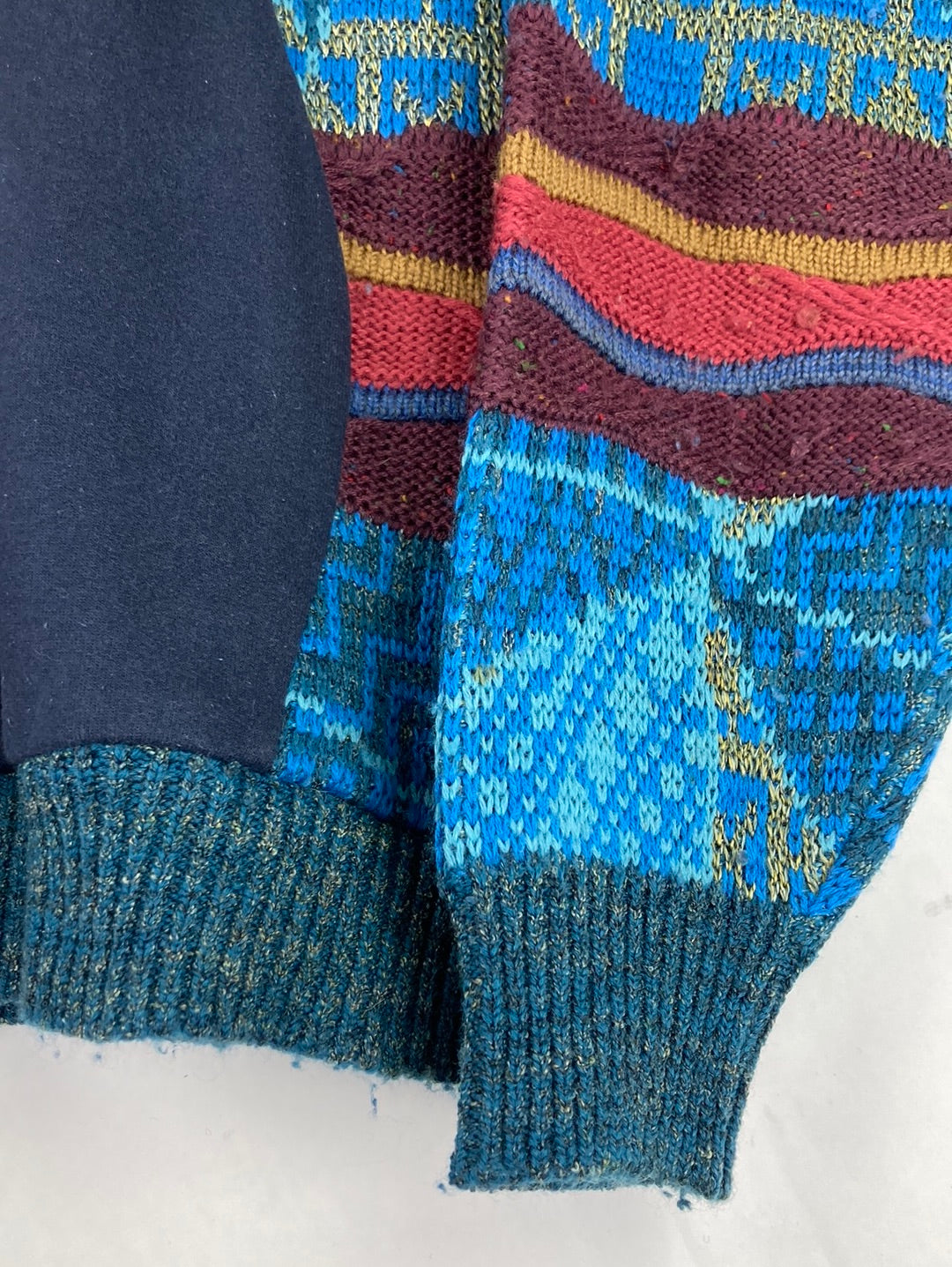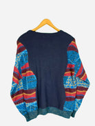 Dieser Sweater ist ein One-out-of-One Produkt und wirklich einmalig. In mühevoller Handarbeit ist hier aus zwei beschädigten Kleidungsstücken ein Re-Worked Piece entstanden. Farblich toll aufeinander abgepasst fügen sich die Elemente des alten Strick Pullovers in den sportlichen Style des Sweaters.