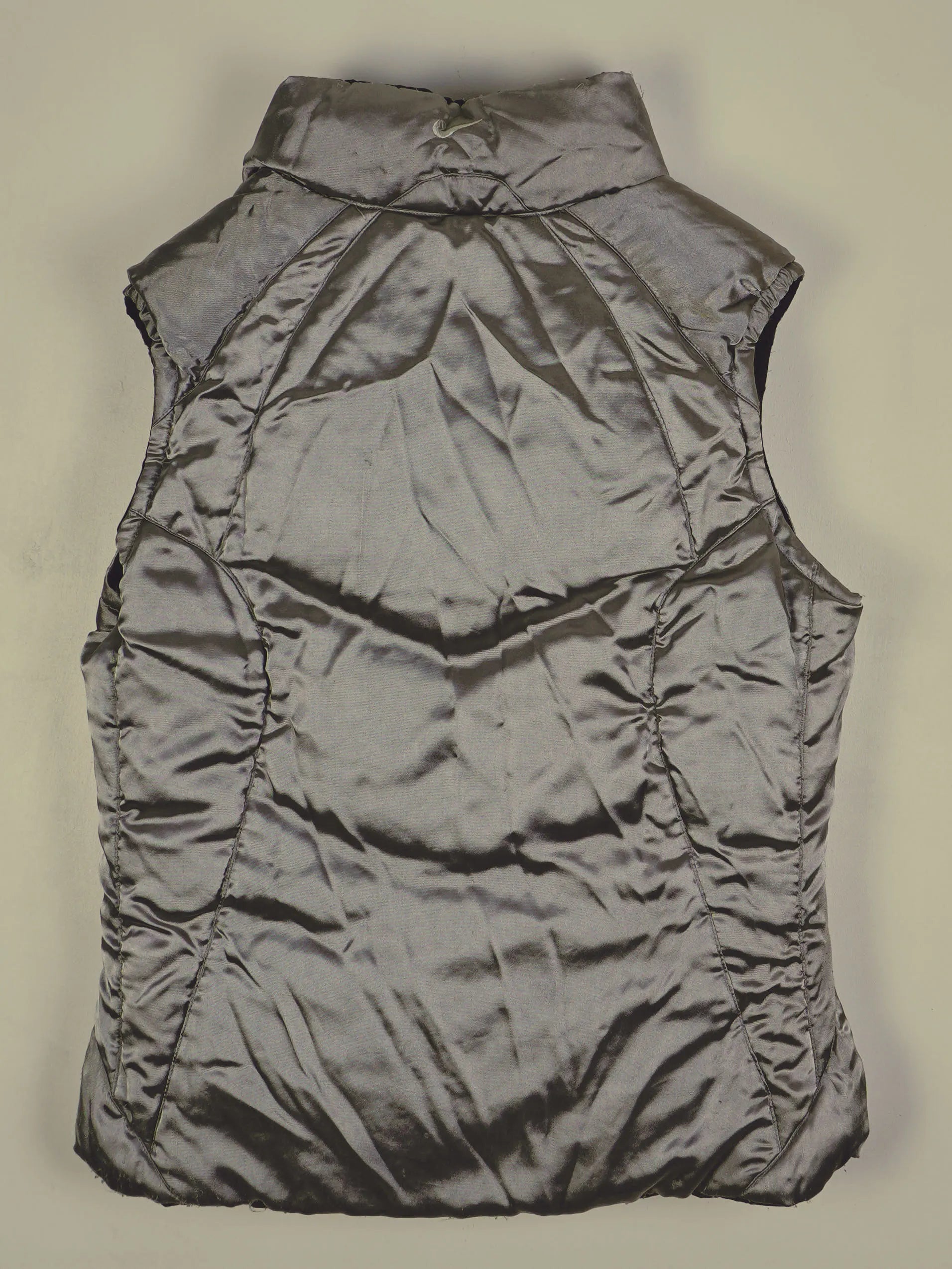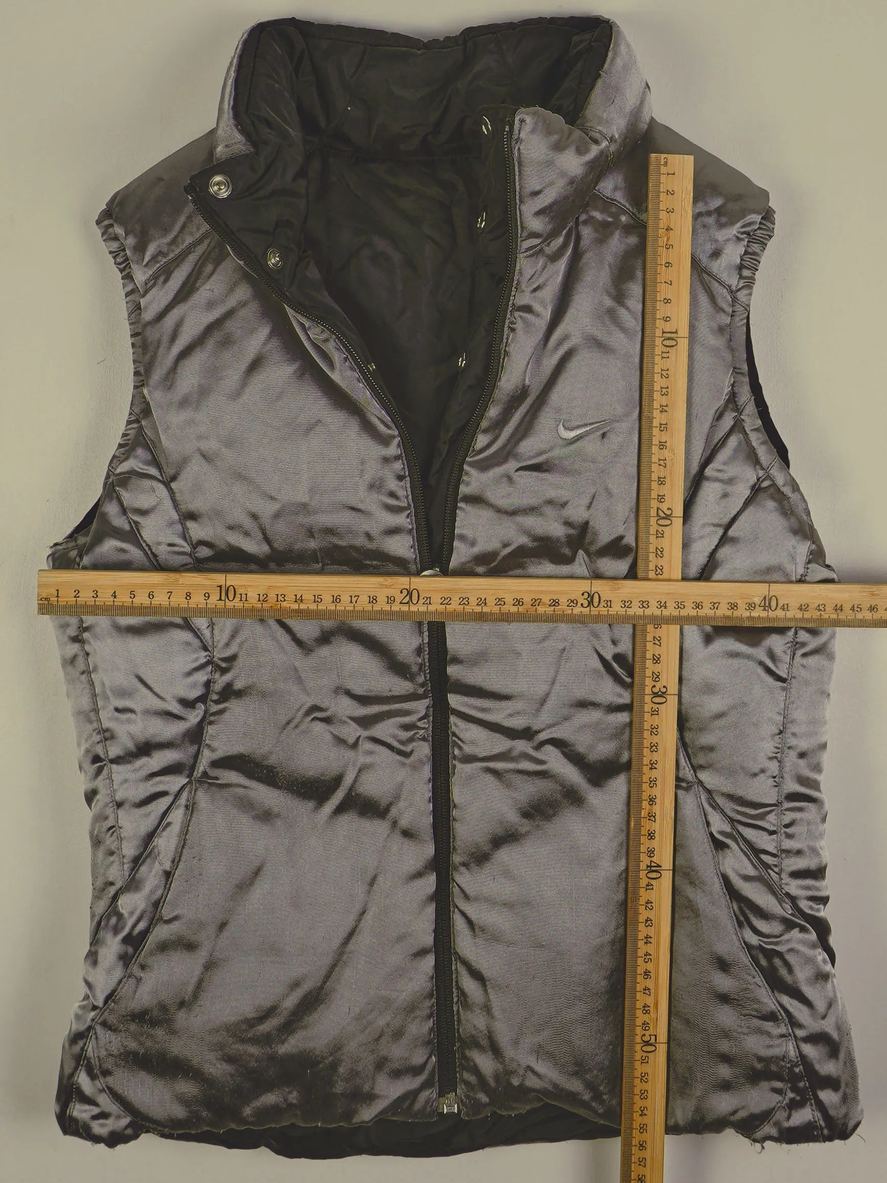 Nike Weste in Silber, in Größe S. Bitte die Maße im Bild 3 beachten und diese für eine optimale Größeneinschätzung mit einem Kleidungsstück bei dir Zuhause vergleichen.
