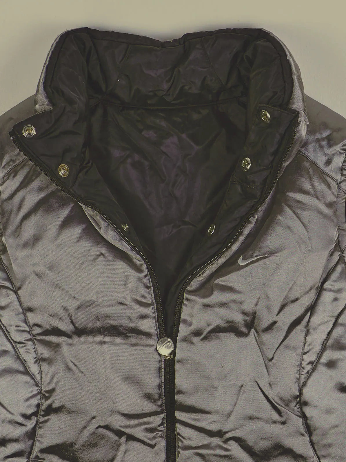 Details: Metallisch schimmernder Stoff, Swoosh-Logo auf der linken Brust, Stehkragen, Reißverschluss mit Druckknöpfen, klassische Steppung, seitliche Raffungen im Hüftbereich.
