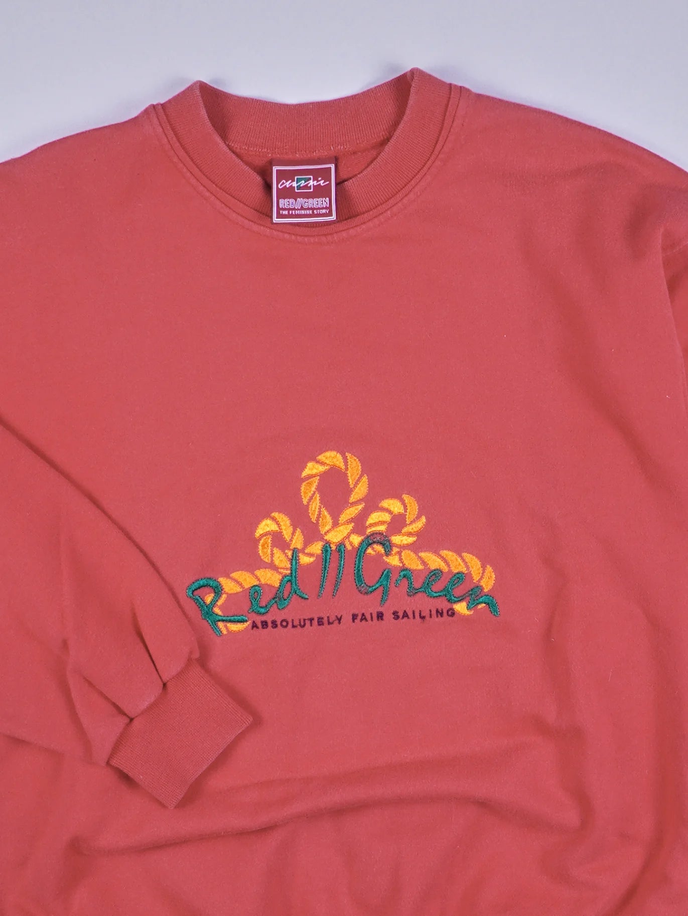 Details: Ein roter Pullover mit aufwendiger gestickter Verzierung an der Vorderseite, die ein maritimes Motiv mit dem Schriftzug 'Red n' Green' und dem Untertext 'Absolutely fair sailing' zeigt.